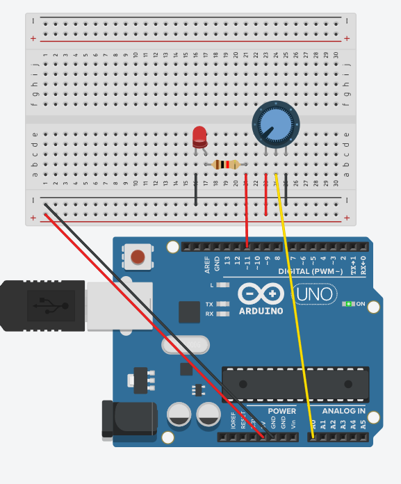 The Arduino reads the value from A0 and converts it to a range of 0–255 (LED brightness).